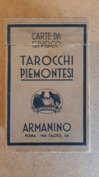 Scatola vintage di carte da gioco Tarocchi Piemontesi. - Marca: Armanino - Edizione: Roma - Via Tacito, 54 - Design: Illustrazione centrale con scena e nome del produttore Rare Carte Vintage edizione Aprile 1941 edite da Armanino Mazzo completo con tutti gli Arcani in scatola cartoncino robusto. Le Carte da gioco sono 56: notare che il fante è nelle due versioni, maschile e femminile Le carte degli Arcani sono 21 (numerate dallo 0 al 20) Interessante edizione vintage in ottime condizioni anche se usato.