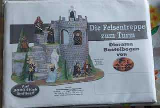 Diorama Die Felsentreppe zum Turm da Il Signore degli Anelli. - Edizione limitata a 3000 pezzi. - Prodotto da Dragon Design / ergo-media. - Anno di produzione: 2002. - Include il Bastelbogen (kit di montaggio in cartoncino). - Figure non incluse. - Per sorpresine Kinder