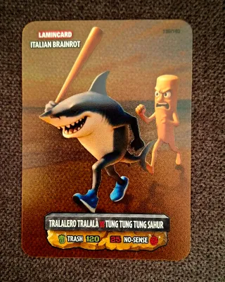 Lamincard della serie Multiverse. - Modello: Italian Brainrot. - Numero: 139/162. - Valori: TRASH 120, NO-SENSE 25.