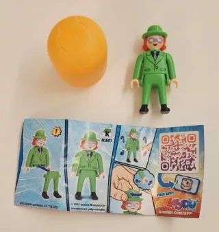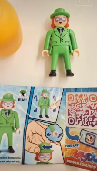 Sorpresa Kinder con personaggio Playmobil della collezione DC del 2025. - Personaggio: The Riddler. - Include foglietto illustrativo con istruzioni e codice QR per l'app. - Prodotto ufficiale DC Comics e Playmobil.