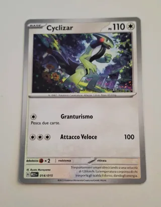 Carta Pokemon di tipo Base, nome Cyclizar. - PS: 110 - Attacco: Granturismo (Pesca due carte) - Attacco: Attacco Veloce (100) - Debolezza: x2 - Resistenza: - - Ritiro: - - Illustratore: Ryota Murayama - Numero carta: 014/015