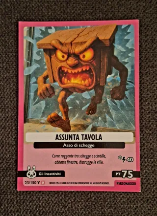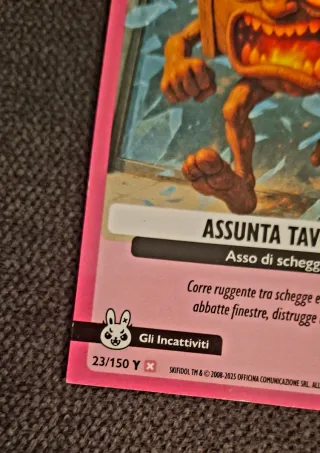 Carta da collezione Skifidol, serie Gamma. - Personaggio: Assunta Tavola - Sottotitolo: Asso di schegge - Punti: 75 - Numero carta: 23/150 Y X - Categoria: Gli Incattiviti