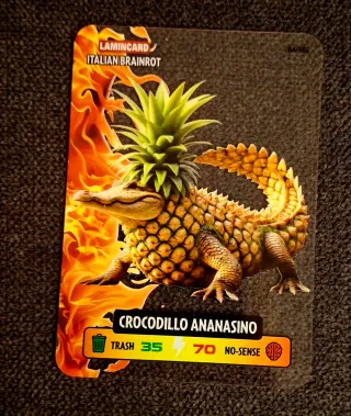 Lamincard Italian Brainrot con il personaggio Crocodillo Ananasino. - Illustrazione di un coccodrillo con testa di ananas. - Elementi grafici di fiamme. - Valori indicati: Trash 35, No-Sense 70.