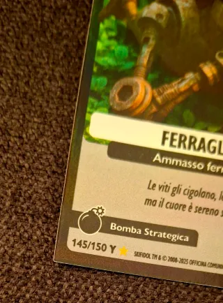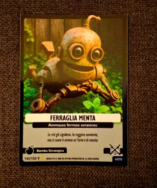 Carta Ferraglia Menta della serie Gamma di Skifidol. - Ammasso ferroso senziente - Testo: Le viti gli cigolano, la ruggine aumenta, ma il cuore è sereno se l'aria è di menta. - Icona Bomba Strategica - Numero carta: 145/150 Y - Diritto d'autore SOFIDOL TM & © 2008-2025 OFFICINA COMUNICAZIONE SRL. ALL RIGHTS RESERVED.