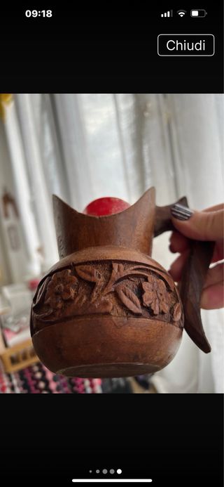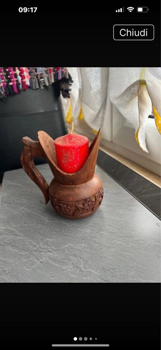 Elegante vasetto in legno, perfetto per contenere candele o piccoli oggetti decorativi. La sua lavorazione artigianale aggiunge un tocco di calore. - Realizzato in legno intagliato. - Design unico con manico.