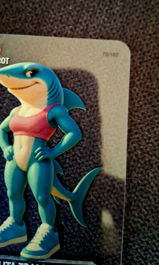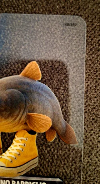 Lamincard della serie Italian Brainrot Multiverse. - Raffigurazione di un pesce con scarpe. - Valori Trash 40 e No-Sense 85. - Numero carta 48/182.