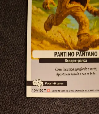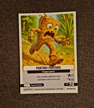 Carta Pantino Pantano dalla serie Gamma di Skifidol. - Personaggio: Pantino Pantano - Abilità: Scappa-panta - Punti: 70 - Valori: 30 / 35 - Numero carta: 104/150