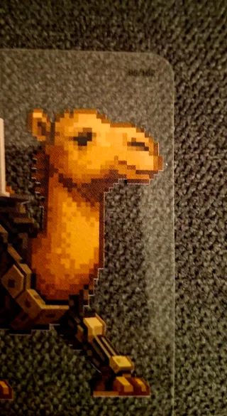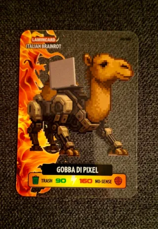 Lamincard Italian Brainrot con artwork Gobba di Pixel. - Illustrazione in stile pixel art. - Elementi grafici a tema fuoco e robotico. - Valori Trash 90 e No-Sense 160 indicati.