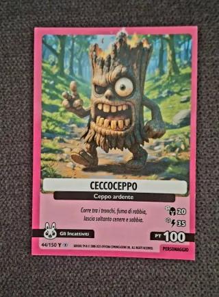Carta Ceccoceppo della serie Gli Incattiviti di Skifidol, edizione italiana. - Personaggio: Ceppo ardente - Punti: 100 - Numero carta: 44/150 Y - Serie: Gamma