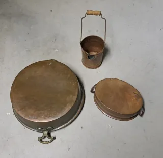 Set di pentole in rame, ideali per la cucina o come arredamento composto da tre pezzi. Comprende: un tegame in rame stagnato rotondo di diametro 27 cm sul fondo, diametro superiore 31 cm e altezza 8 cm con manici in ottone. Un tegame in rame ovale 20 x 14 altezza 8 cm circa. Un bricco in rame con manico di diametro 10 cm e altezza 12 cm circa.