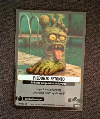 Carta Piedonzo Fetonzo della serie Skifidol simbolo nero - Numero carta: 118/150 - Simbolo: Bomba Strategica - Testo: Brillante nel putrido multiverso. Lingua di muco, schizzi di soff. puzza che fa bleah, squelch e ploff! - Dicitura: Aiuto