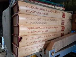Set di volumi dell'enciclopedia Grande Enciclopedia Antiquariato e Arredamento. - Copertina rigida color crema. - Titoli e volumi stampati in rosso. - Edizioni editalia.