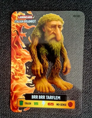 Lamincard Italian Brainrot con numero 60/182. - Illustrazione di un personaggio fantasy. - Elementi grafici a tema fuoco. - Valori Trash 15 e No-Sense 65.
