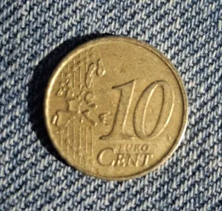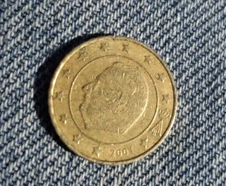 Moneta da 10 centesimi del Belgio, anno 2001. - Dritto: Ritratto del Re Alberto II del Belgio. - Rovescio: Valore nominale e mappa dell'Europa.