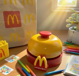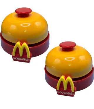 Campanello da bancone con base rossa e cupola gialla, con pulsante rosso. - Design a forma di campana. - Logo McDonald's presente sulla base.