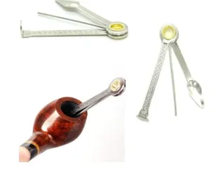 Strumento multiuso compatto, identificato, pulitore o attizzatoio per pipe antiche. Finitura metallica con un motivo a diamante sull'impugnatura per migliorare la presa. Pieghevole, tradizionalmente utilizzato per la manutenzione di pipe da fumo e composto da vari componenti o parti: attizzatoio piatto per compattare all'interno del fornello, scarificatore/lama, lama per pulire i residui di carbone dalle pareti interne, punzone, ago per sbloccare.