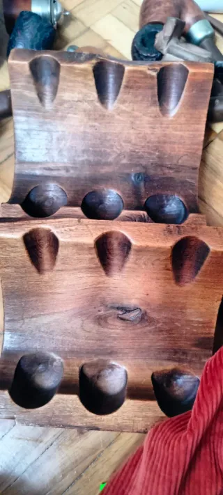 Bellissimo portapipe in legno massello, perfetto per collezionisti. - Realizzato in legno scuro, robusto e ben rifinito. - Dispone di 12 fori per pipe, 12 nella base e 12 nella parte superiore. - Ideale per organizzare e proteggere la tua collezione di pipe.
