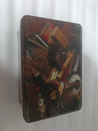 Questa antica lata presenta un design dettagliato con motivi di tabacco e accessori per fumare. Design vintage. Stampa di sigarette, pipe e tabacco. Ideale per collezionisti.