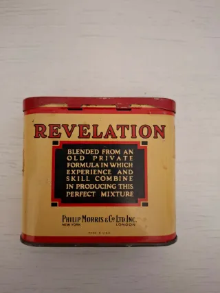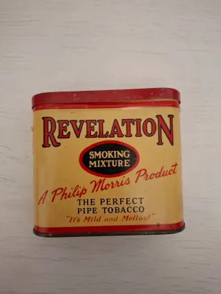 Portasigarette vintage in metallo Revelation di Philip Morris. - Design classico con scritte Revelation e Smoking Mixture. - A Philip Morris Product e The Perfect Pipe Tobacco. - It's Mild and Mellow.