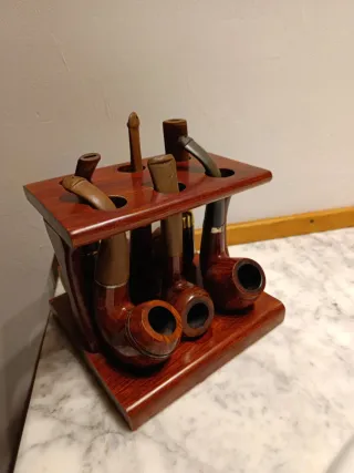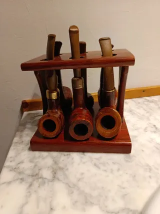 Set di supporto in legno per pipe da fumo e sei pipe. - Supporto in legno scuro. - Include sei pipe di diversi design e dimensioni.