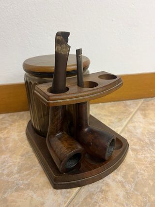 Supporto elegante in legno per diverse pipe da fumo, con un barattolo di vetro con coperchio in legno. Base in legno scuro. Supporto per 3 pipe. Barattolo di vetro con coperchio in legno. Misura 15 cm di altezza per 20 cm.