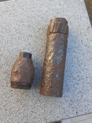 Portopenne originale da scavo di origine tedesca risalente alla Seconda Guerra Mondiale. - Materiale metallico con segni di ruggine. - Due parti separate, una cilindrica e una conica.