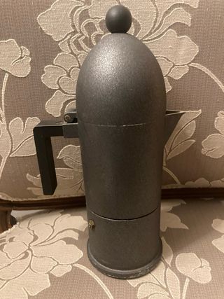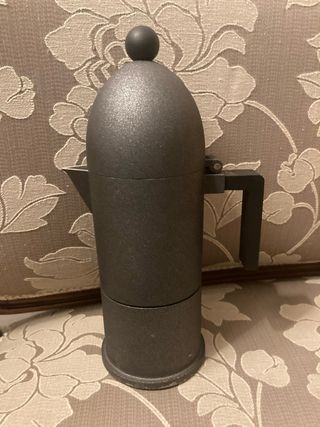 Caffettiera alessi grande , modello cupola, design Aldo Rossi Versione nera fuori produzione, misura grande (credo 6 tazze, misura sui 29 cm circa di altezza) marchio presente all’interno del tappo in plastica. E’ stata usata, presenta segni di vecchio utilizzo e del tempo sia all’interno che all’esterno: all’interno penso si possa migliorare con pulizia approfondita (io non ho provato a pulirla) mentre all’esterno si presenta usurata solamente sotto la base e non sulle altre superfici quindi se esposta non presenta difetti visibili.