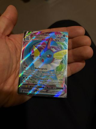Carta Pokémon Vaporeon VMAX. - VMAX Vaporeon VMAX - HP 320 - Attacco: Bollacapsula - Attacco: Dynacquaiuto 100+ - Debolezza x2 - Resistenza - Ritirata - Regola VMAX