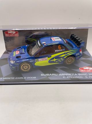 Modellino della Subaru Impreza WRC del Rally Montecarlo 2008 in scala 1/43. - Auto da rally blu con dettagli gialli. - Numero di gara 6. - Sponsorizzazioni visibili sul modello. 13