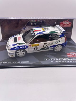 Modellino della Toyota Corolla WRC che ha partecipato al Rally Montecarlo del 2000. - Scala 1/43. - Decorazione J.D. Farrods. - Numero di gara 28. - Equipaggio P. Zanchi - D. D'Esposito. 14