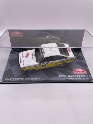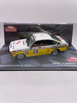 Modellino della Opel Kadett GT che ha partecipato al Rallye Monte-Carlo nel 1978. - Scala 1/43. - Livrea bianca e gialla con numero 20. - Sponsorizzazioni visibili: Opel, Mobil, Conrero, Pirelli, GTE, Rome. - Dettagli fedeli all'auto da corsa originale. 15