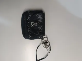 Portachiavi in tessuto scuro con ricamo bianco. - Dettagli con scritte e simbolo Baci e Abbracci'. - Completo di anelli e moschettone per chiavi.
