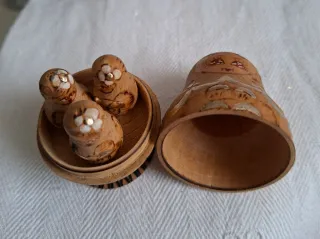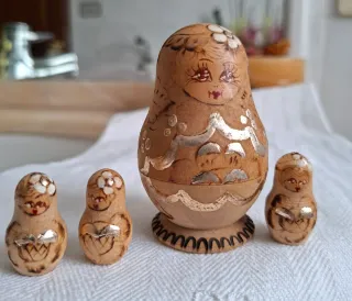 Set di bambole russe in legno, dipinte a mano. - Decorazioni floreali e motivi tradizionali. - Finitura in legno naturale.