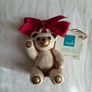 Delizioso orsetto Teddy di Lene Thun, un pezzo vintage da collezione. - Design classico e dettagli curati. - Finitura in ceramica con inserti dorati. - Fiocco rosso decorativo.