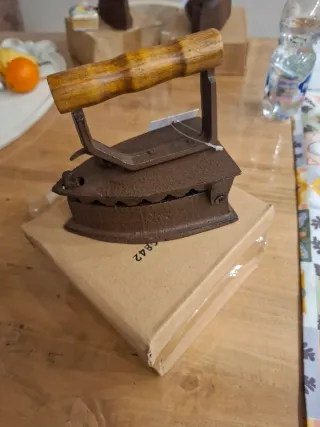 Ferro da stiro d'epoca in ghisa, un pezzo da collezione. - Manico in legno. - Base piatta in metallo scuro. - Design robusto e tradizionale. Perfetto Misure 13x8,5x12