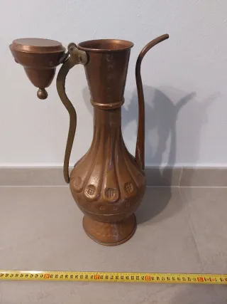Elegante brocca o teiera d'epoca, realizzata in rame. - Materiale: Rame - Design decorato Elegante di stile islamico o ottomano, caratterizzata da un corpo cesellato e un alto beccuccio curvo. Materiale: Rame. Dimensioni: L'altezza è di circa 49 cm. Stile: Islamico, ottomano o arabo, spesso decorato con motivi sbalzati. Utilizzo: Oggetto decorativo o da collezione