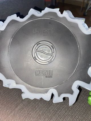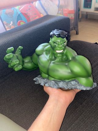 Figura di Hulk Marvel che funge da porta-monete. Design iconico del personaggio. Base con effetto roccia.