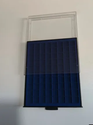 Vassoio porta monete con 80 alloggiamenti individuali. - Colore blu scuro. - Ideale per la conservazione di monete di piccole dimensioni. - Include una copertura trasparente protettiva.