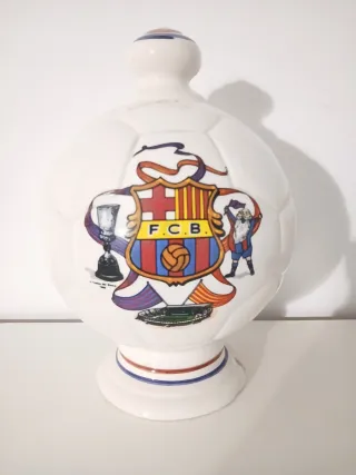 Porta monete originale a forma di pallone da calcio del FC Barcelona. Manca il tappo inferiore. Design ispirato allo stemma del club. Dettaglio di trofeo e giocatore. Base con i colori del club.