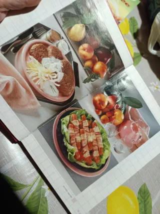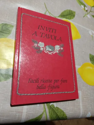 Ricettario Mulino Bianco Inviti a Tavola. - Copertina rigida rossa. - Illustrazione decorativa con fiori e casa. - Testo Facili ricette per fare bella figura.