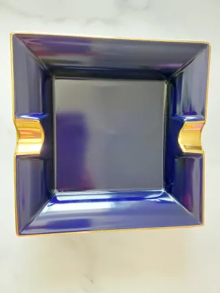 Elegante posacenere o svuotatasche in fine porcellana bavarese firmato Bavaria Germany serie "Ludwig"blu cobalto con finiture in oro zecchino. Misura cm 18 x cm 18 . - Colore: Blu intenso con dettagli oro. - Materiale: Ceramica lucida. - Design: Quadrato con bordi rialzati e incavi per sigarette.
