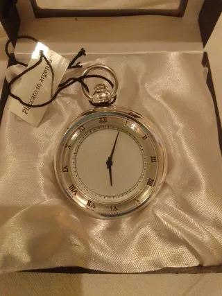 Elegante orologio da tasca con finitura placcata in argento. Presentato nella sua scatola originale, è un accessorio raffinato. - Cassa rotonda in metallo. - Quadrante con numeri romani. - Anello superiore per catena. Da riparare staccata la parte superiore vedere ultima foto.