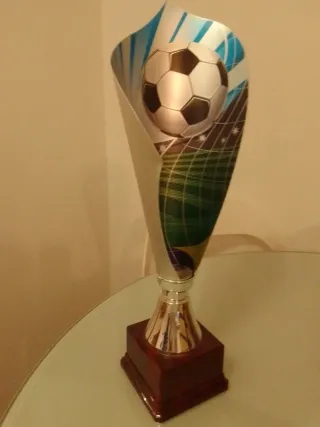 Bellissimo trofeo sportivo a tema calcistico, ideale per premiazioni o come oggetto da collezione. - Design a cono con grafica a tema calcio. - Base in resina scuro. - Dettagli argentati lucidi. Altezza 46 cm