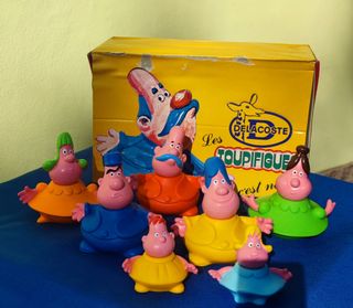Delacoste Les Toupifigues C'est Nous ! Pupazzi Francesi, In Gomma Serie completa di 7 personaggi. Scatola con alcuni segni del tempo, come da foto. Non puliamo i pezzi, per non intaccare i colori.