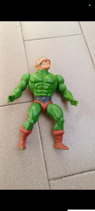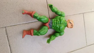 Action figure of Man-At-Arms from Masters of the Universe. This figure is green with orange accents. Da revisionare eleatico - Green muscular body. - Orange boots and belt. - Detailed head sculpt.