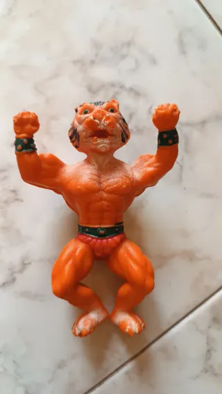Personaggio giocattolo di un guerriero tigre arancione. - Dettagli muscolosi. - Bracciali verdi con borchie. - Cintura verde con fibbia rosa.
