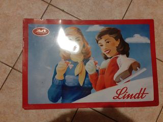 Bellissimo quadro pubblicitario vintage della Lindt Lindor. Perfetto per gli amanti del cioccolato e del vintage! - Quadro in latta - Motivo: due donne con pattini a rotelle e cioccolatini Lindor - Ottime condizioni, segni minimi del tempo