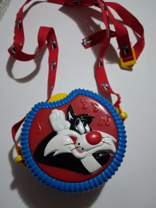Radio vintage con il personaggio Gatto Silvestro dei Looney Tunes. Un pezzo da collezione per gli appassionati. Nel coperchio dietro c'era l'auricolare (non presente), tracolla leggermente sfilacciata in alcuni punti ma complessivamente è in ottime condizioni, radio FM non funziona. Larghezza circa 9,5 cm. - Design colorato con Gatto Silvestro. - Cordino rosso con stampa. - Cornice blu e rossa.