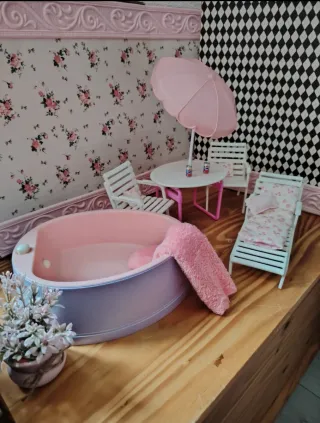 Set vintage per bambole Barbie, Spa Meritus del 1984. Un'aggiunta perfetta per la collezione. - Vasca da bagno rosa e lilla. - Lettino prendisole con cuscino. - Tavolino rotondo con ombrellone e sedie. - Accessori inclusi.