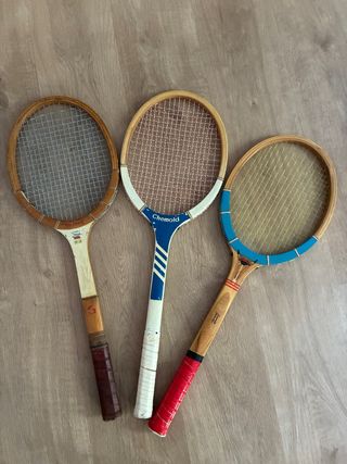 Tre vecchie racchette da tennis, in legno e corde. Ideali per collezionisti. Due di esse sono perfettamente conservate e l'altra è un po' ovale. Si vendono separatamente. 10 euro ciascuna. Se ne vuoi tutte e 3 adattiamo il prezzo. - Legno e materiali classici. - Design retrò. - Marchi visibili sulle racchette.